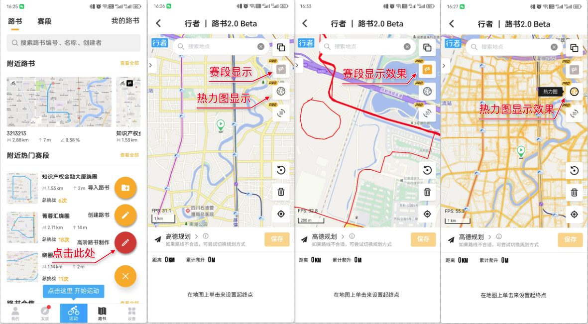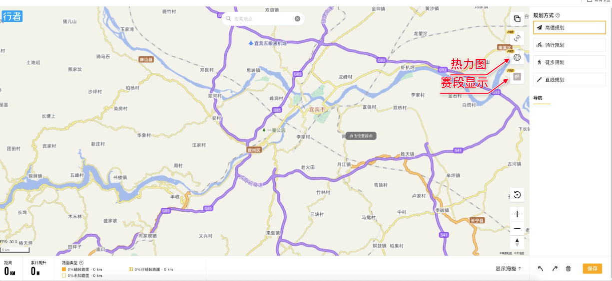 4.在路书制作页面右上角即可找到「赛段」与「热力图」的开启按钮。