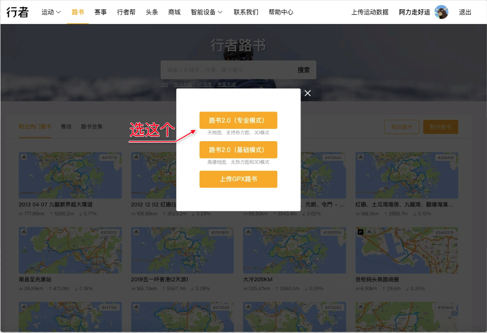 3.进入路书页面后点击「制作路书」选项,然后在弹出来的选项里点击「路书2.0(专业模式)」